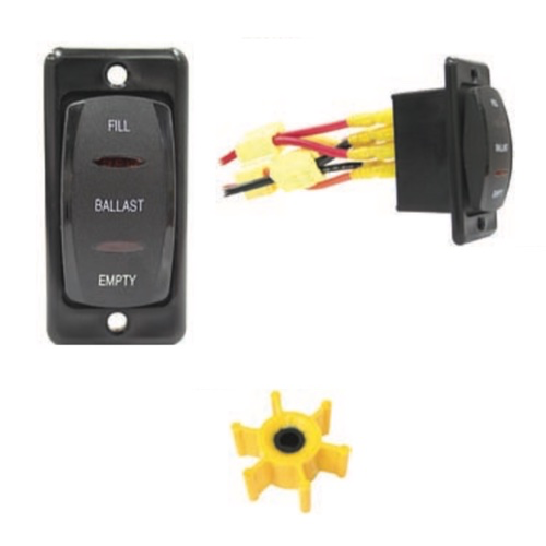 Self priming to 1.2 metres (4 feet), won't airlock and has exclusive run dry protection and ignition protected motor. Supplied with a special red polyurethane compound impeller that handles reversing with ease. Supplied with high quality dash mount switch unit marked "Ballast" fill and empty, complete with fitted connectors and long heavy duty electrical wiring.