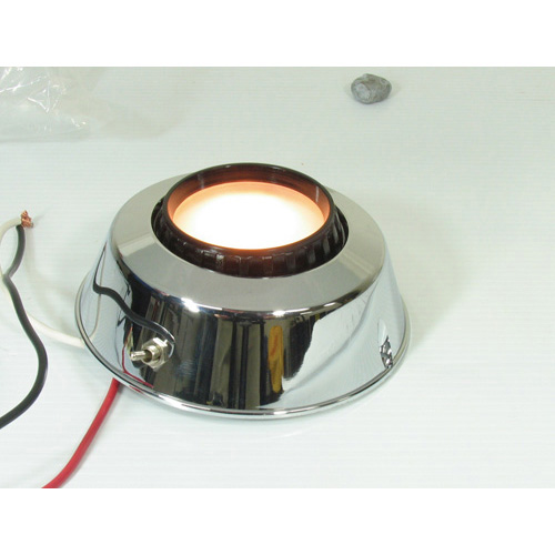 Surface mount directional eye ball interior downlight with integral toggle switch. Gloss chrome finish moulded plastic housing. Frosted polycarbonate lens. 10 watt, 12 volt halogen bulb.