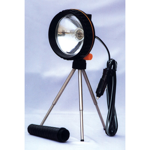 Quartz halogen spotlight that can be hand held or free standing by utilising the unique tripod located in the screw-off handle. Powerful 200mm 1,500,000 candle power beam. Adjustable head inclination. 12 volt, three metre power lead fitted with a cigarette lighter plug.
