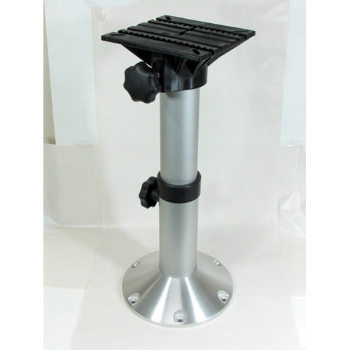 Built for the saltwater environment with anodised aluminium, glass filled nylon and stainless steel materials. Solid construction, 73mm x 3mm base tube, 66mm x 3mm top tube, both internally rib reinforced, heavy duty die cast alloy base and heavily reinforced glass nylon swivel head assembly. Mount base suits countersunk screws or hex head. Used to convert dinettes into bunks. Height is adjustable via a simple friction locking handle. The telescopic centre tube retracts through the floor and requires 173mm clearance below the floor. Adjusts from 340mm to 680mm above floor.