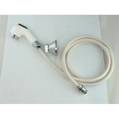 Installed in conjunction with shower mixer taps. White reinforced hose. Compact white handset with integral on/off button and adjustable flow control (stream/spray). Chrome finish ABS plastic wall mount bracket included.