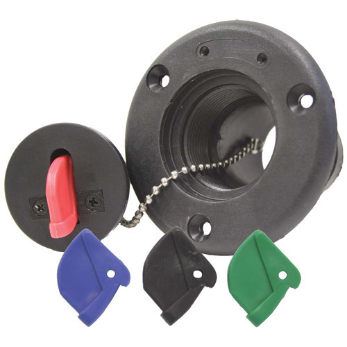 Universal type black nylon deck fillers with pop-up key for easy use. Supplied with four different coloured keys - red for fuel, blue for water, green for diesel and black for waste. A complete set of six metallic labels (Stick-on/screw-on) is also included -diesel, fuel, gas, petrol, water and waste.