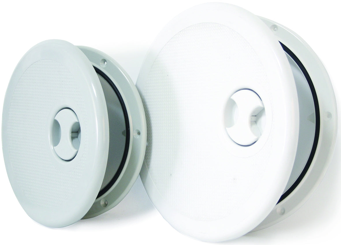 Round storage access hatches that have a hinged lid which opens a full 180 degrees.