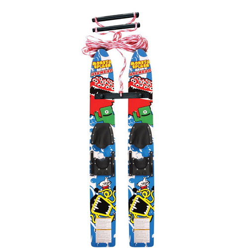 These 119cm wood trainers make learning to ski fun for beginners under 45kg. The double handle rope assembly, removable crossbar and ties at the tail make it easy to start and control. The adjustable bindings fit child size 12 to adult size 5. Fibreglass reinforced nylon rudders increase stability and tracking.