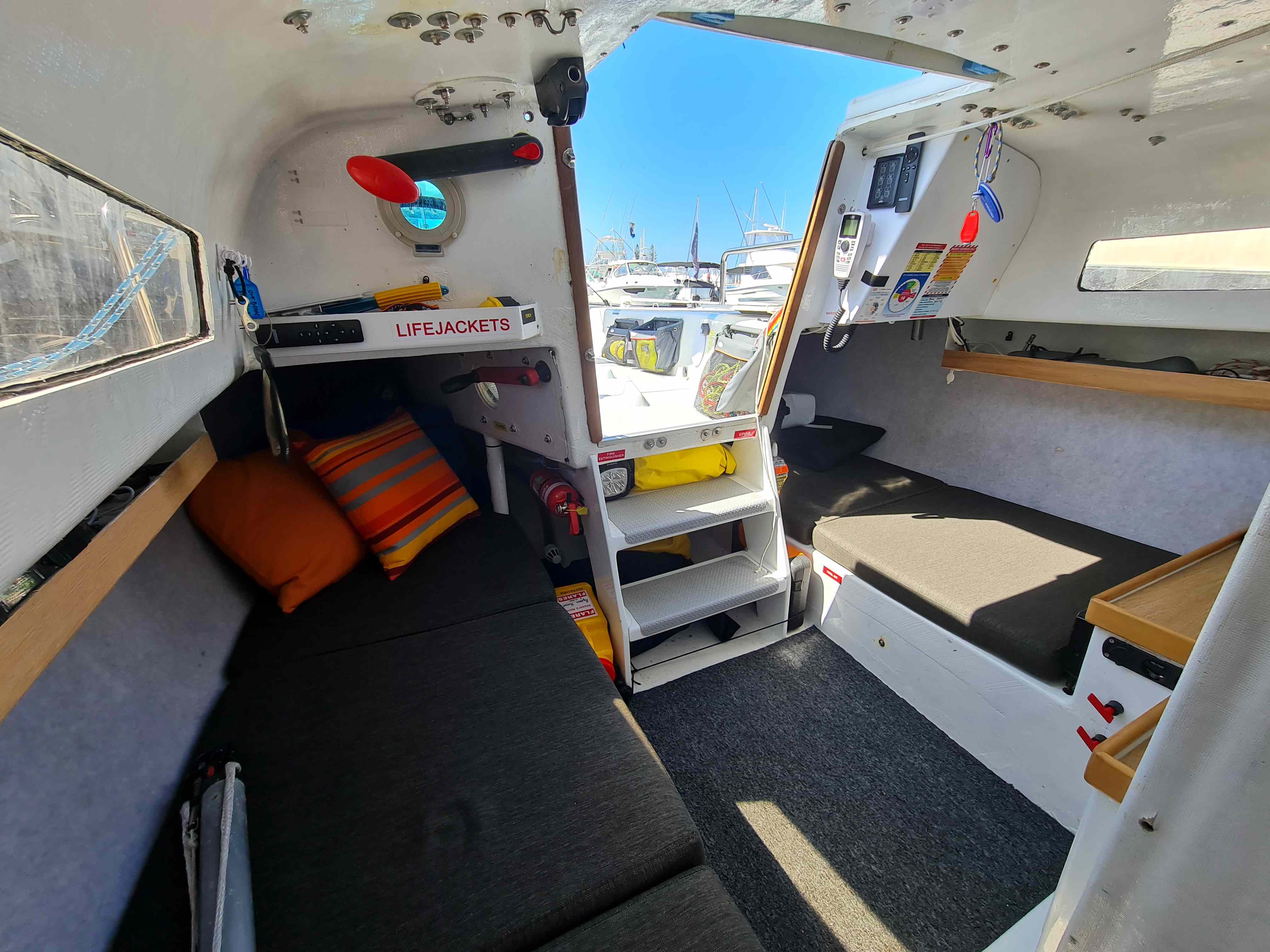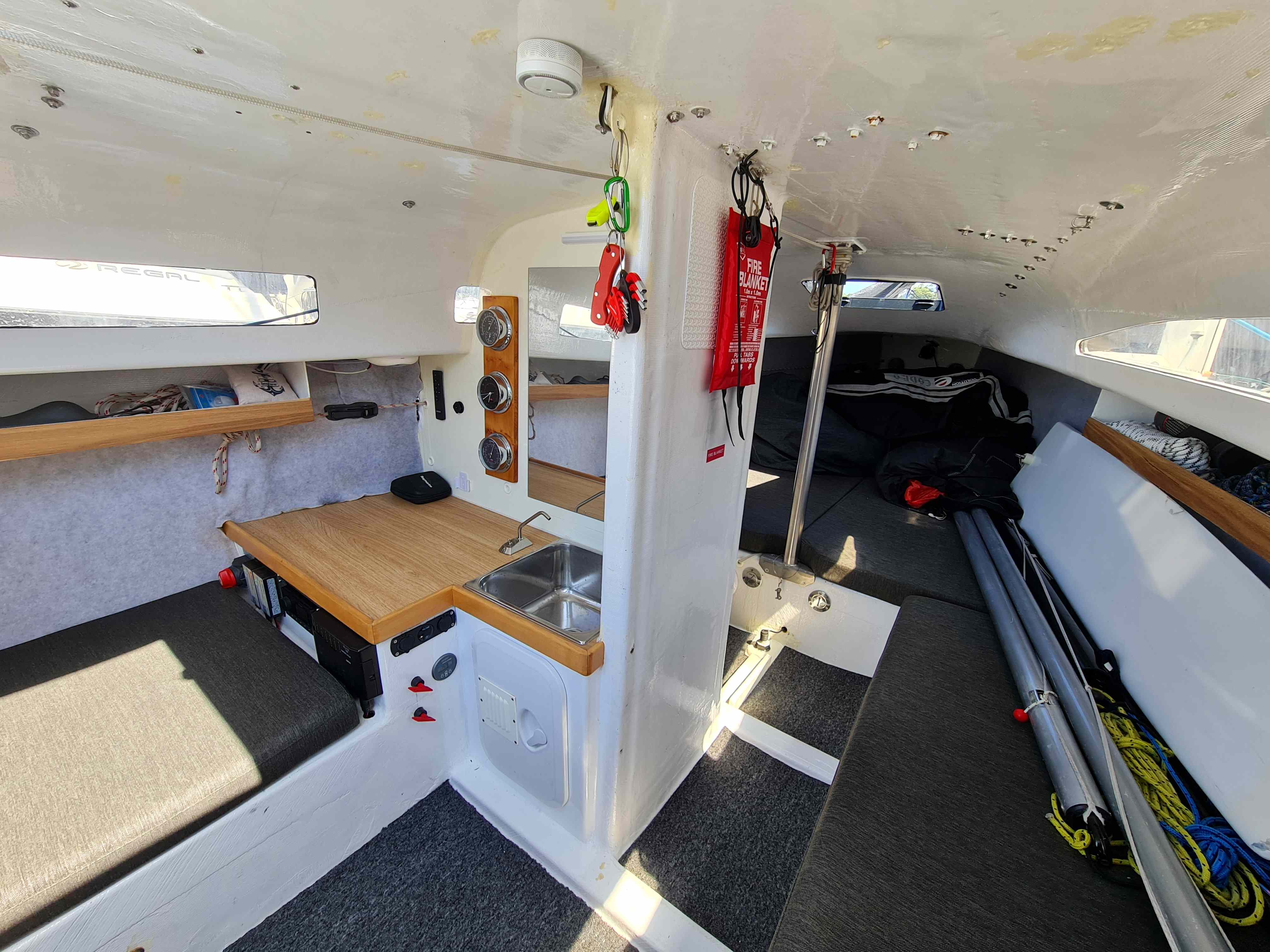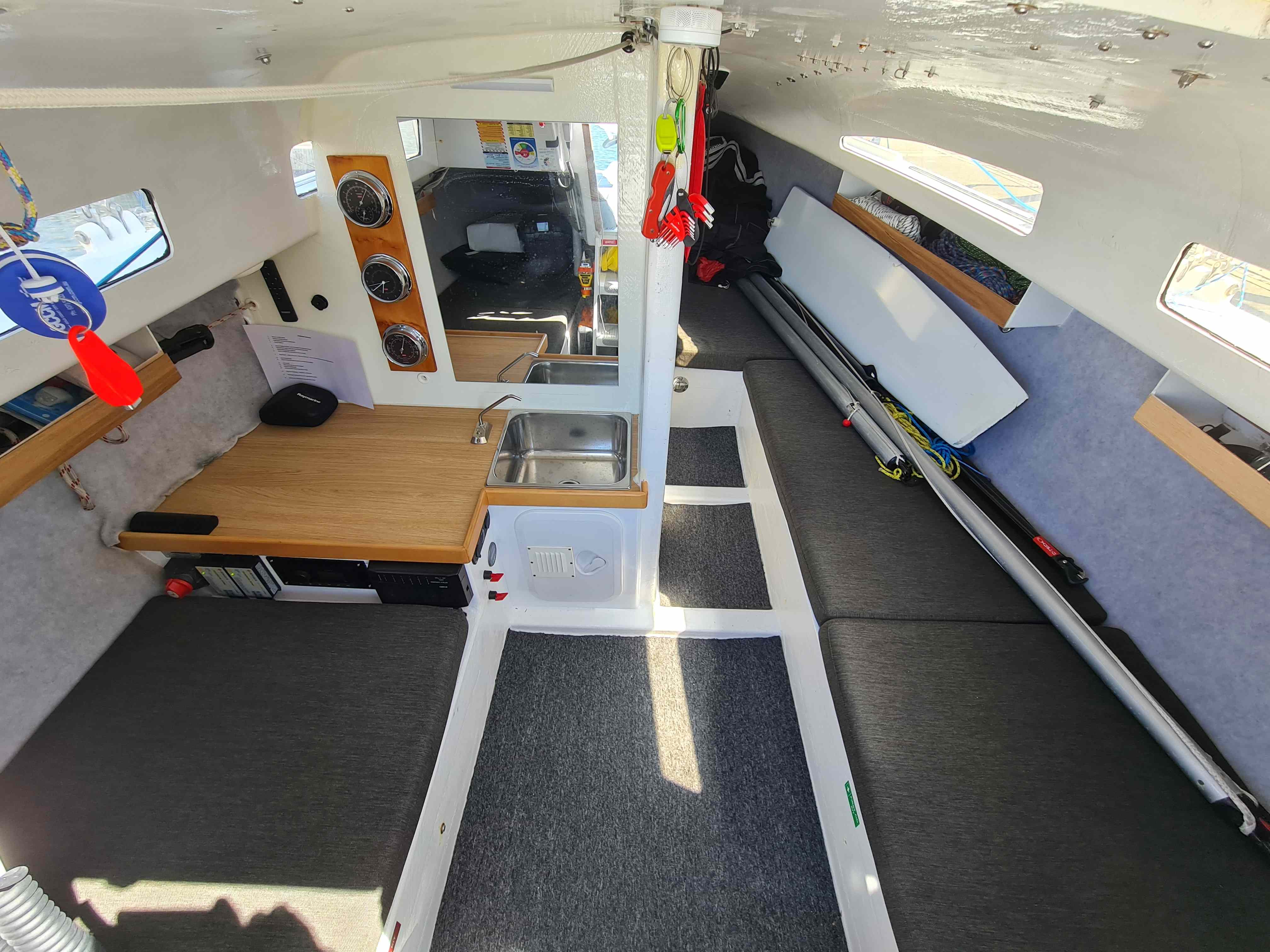 At 8.0 m LOA and 2.5 m beam, she is built to the maximum legal trailerable dimensions, offering impressive interior volume without compromising performance or ease of handling. Her rig and deck layout have often been compared to an Elliott 7 / 7.8, however the upgrade to a masthead carbon rig delivers even more power and pace than the original alloy spar.