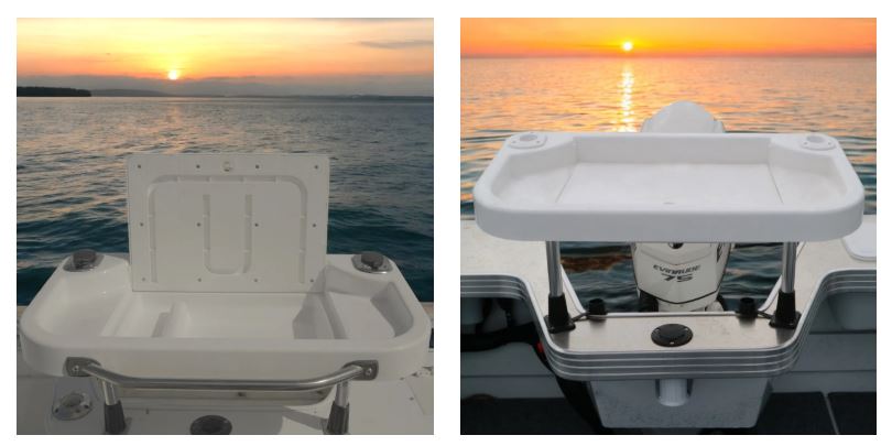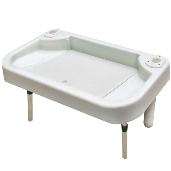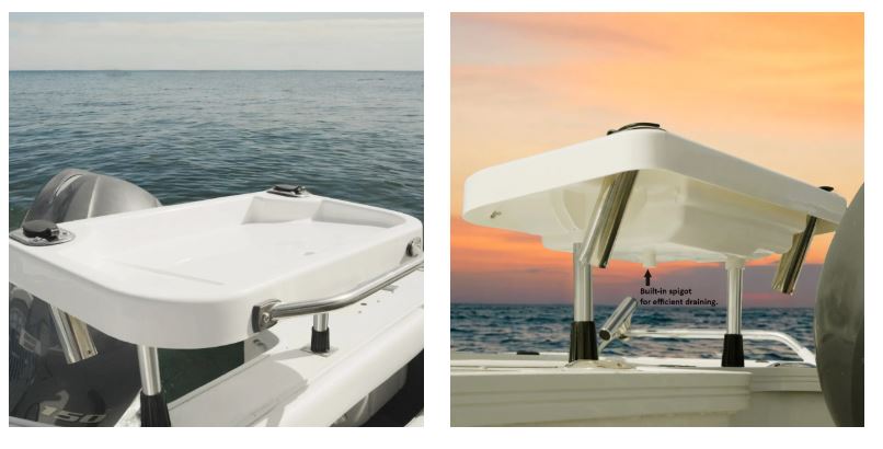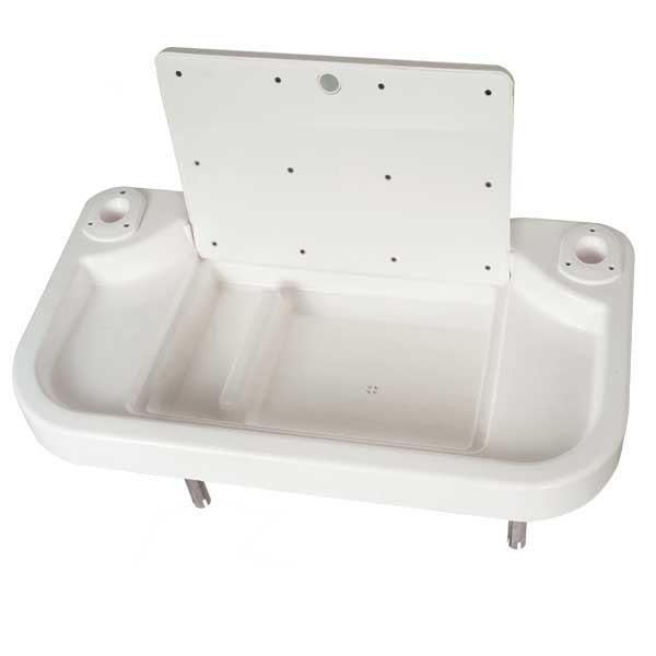 - Hinged Lid: The ingenious space-saving design features a cutting and filleting board on top, with a sink and drain hole positioned underneath.