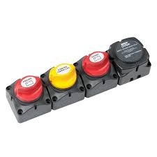 Battery Management Systems makes twin battery charging easy! Pre-assembled module with solid links and application labels combining three 701 Mini Battery Master Switches with a 100 amp Voltage Sensitive Relay.