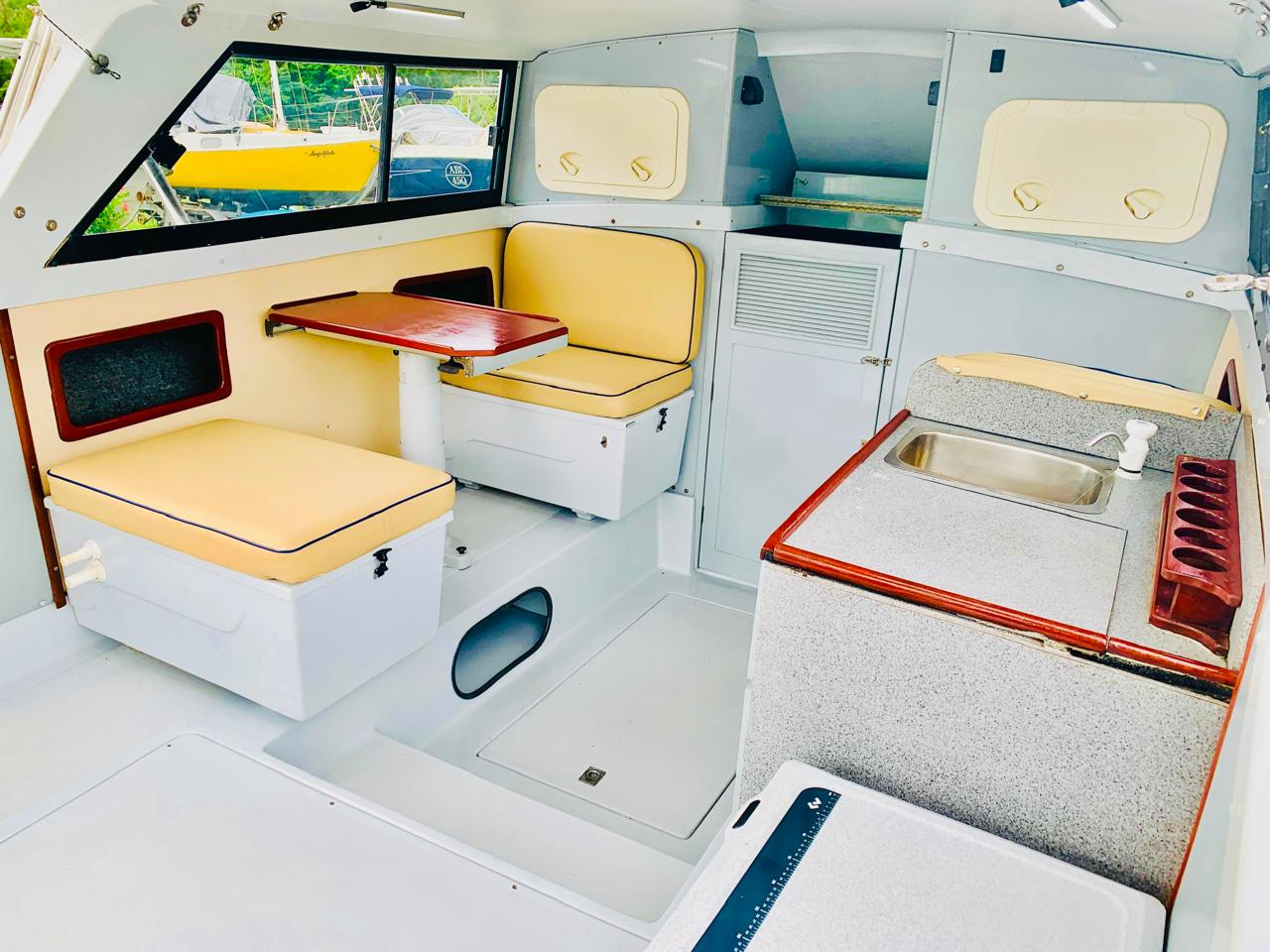 Re-upholstered cockpit seating with adjustable teak table