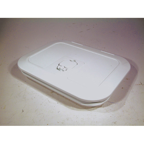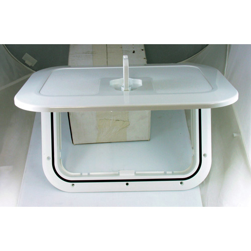 Inspection hatches moulded in white Luran® plastic with low profile lid which fully covers the mounting flange, concealing the fastenings and deflecting water away from the hatch seal. The full covered lid opens 180º to lay flat and features a non-skid surface to facilitate deck mounting. Suitable for mounting on any flat surface, weatherproof when mounted on vertical flat surfaces. Screw holes 5mm countersunk. Protrusion above deck 17mm. An optional key lock set is also available.