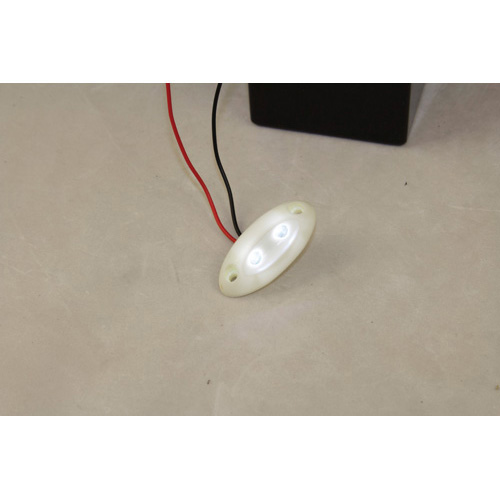 Ultra small surface mount courtesy light featuring two 12 volt LEDs. Housed in a sturdy weather resistant nylon shell. Complete with attached wiring.