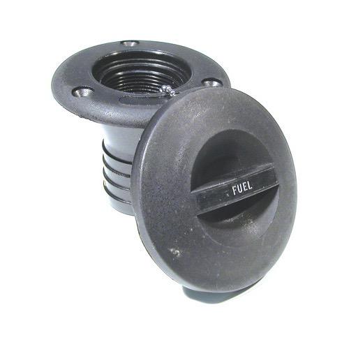 Black nylon deck filler. Finger grip cap with 'O' ring creates an umbrella cover over base to prevent contaminant entering. Security chain to prevent cap falling overboard. Caps marked 'Fuel' or 'Water'.