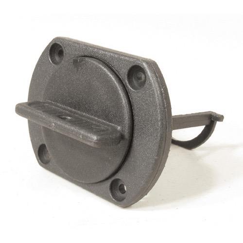 Black, plastic drain plug. Flat flange base for mounting as low as possible on the hull. 'O' ring seal, course four point thread to cope with sand and sediments.