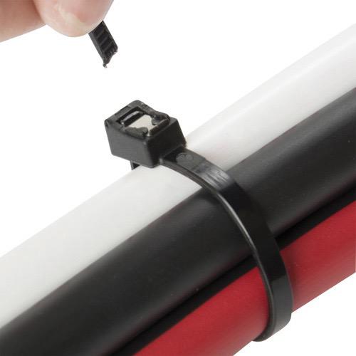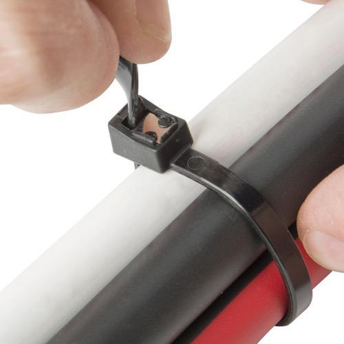 Save time and frustration using this innovative product - a self-cutting cable tie. Simply lock and twist to finish the job, with no need for additional tools. This leaves a clean cut, which improves appearance and eliminates the sharp tail while maintaining a 50 pound tensile strength.