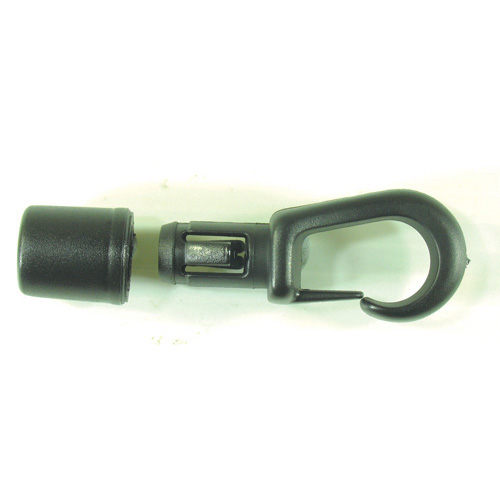 Moulded black nylon hooks with quick fit locking collar mechanism for shock cord, to produce a neat and secure termination.