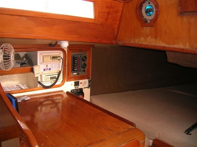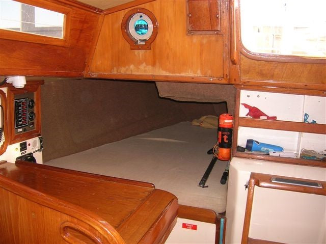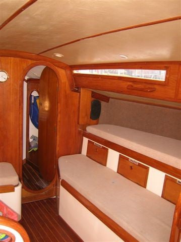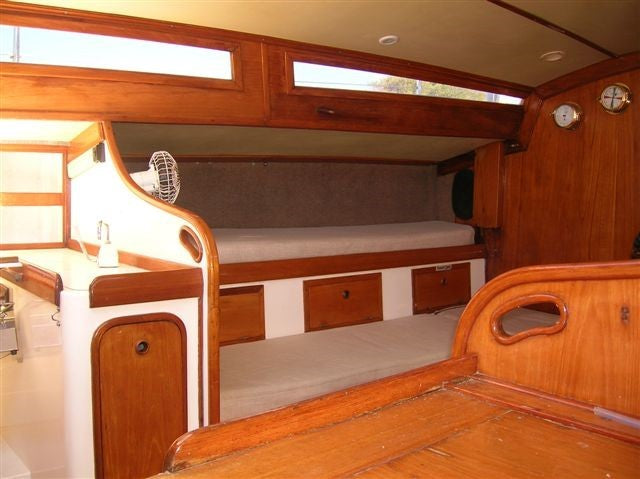 Accommodation Interior structure built using GRP modules with all trim finished in Teak and South African Yellow wood. Fold away removable yellowwood table. Sleeping accommodation provided for 6 adults in two saloon berths, two pilot berths and a double quarter berth aft. Foam mattresses with material covers provided. A further double V berth with covered foam mattresses in forecabin increasing sleeping accommodation to eight adults. Two metre headroom throughout cabin.