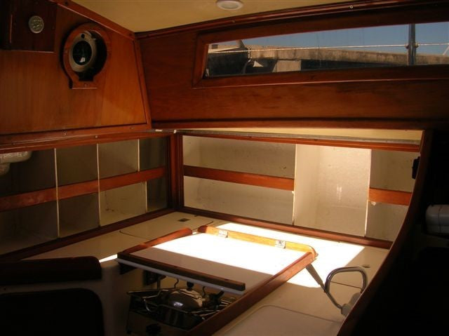 and stowage for cooking utensils and accessories. Stove can easily be upgraded to a gas stove. There is a twin cylinder, drained, enclosed locker in the cockpit.