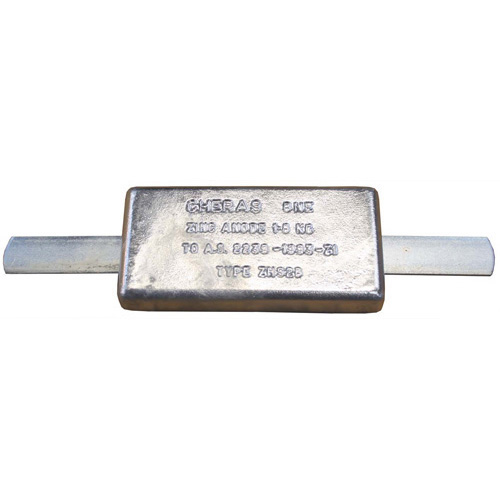 Superb quality range of Australian made "CHERAS" brand zinc anodes. These anodes are manufactured from high grade zinc alloy - 99.9% pure - and conform to Australian Standard AS2239 and U.S Military spec. 18001J . They have an excellent clean, presentable finish for open shop display. Each anode has the Australian Standard number, the weight and the anode code number stamped into it for easy identification. A large range of anodes are available to suit most applications.