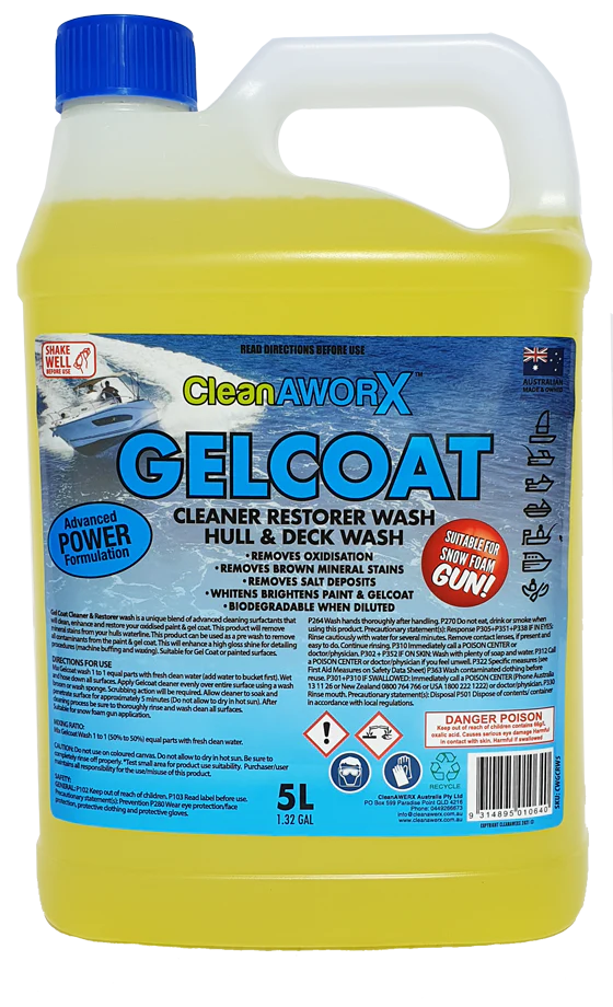Gelcoat and Paint Cleaner Restorer Wash Australian Made. High performance Gelcoat Cleaner restorer, Cleans removes oxidisation off gelcoat and paint. Removes oxidisation, pollutants. soot, mould, previouse waxes, Hull brown mineral stains. Whittens brightens gel coat, Was developed as a PRE - WASH to remove contaminates ready for a full buff polish and detail. Hull and Deck Acid Wash. Suitable for use on all gelcoat and painted surfaces wash clean your boat remove contaminants Ready for full cut and polish detailing.