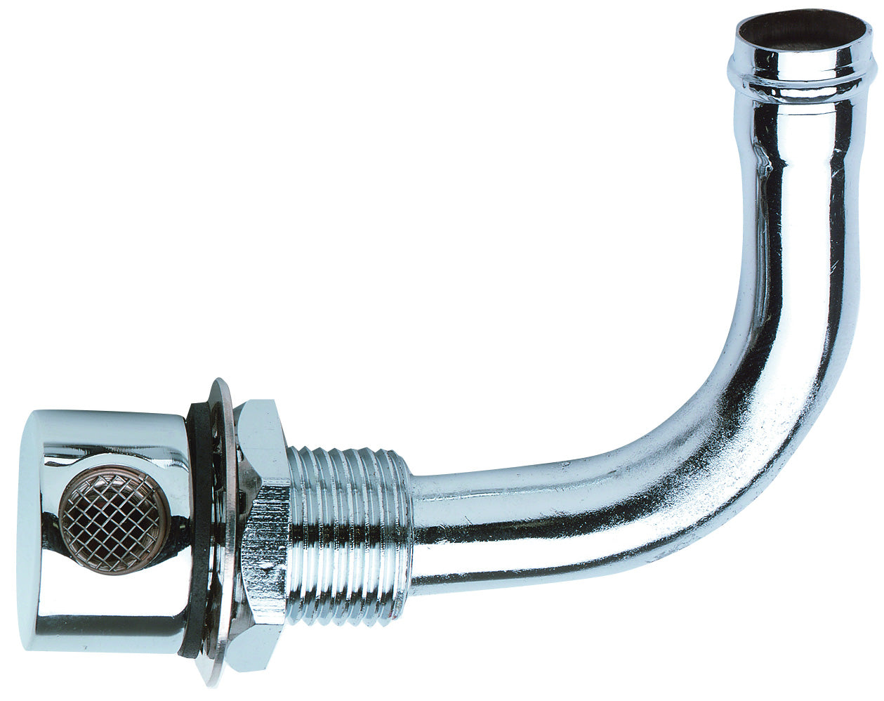 Chrome plated brass fuel breather vents with 90 Degree bend and stainless steel mesh spark arrestor.