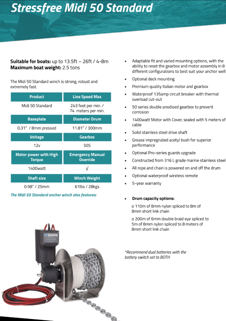 The Stressfree Marine Mini Me Standard anchor winches additionally feature: