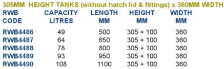 The tanks come in 2 different height sizes with 5 different litre capacities in each. A blind sealing hatch lid is also available.