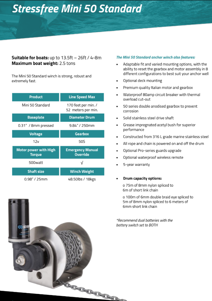 The Stressfree Marine Mini Me Package 4 anchor winches additionally feature: