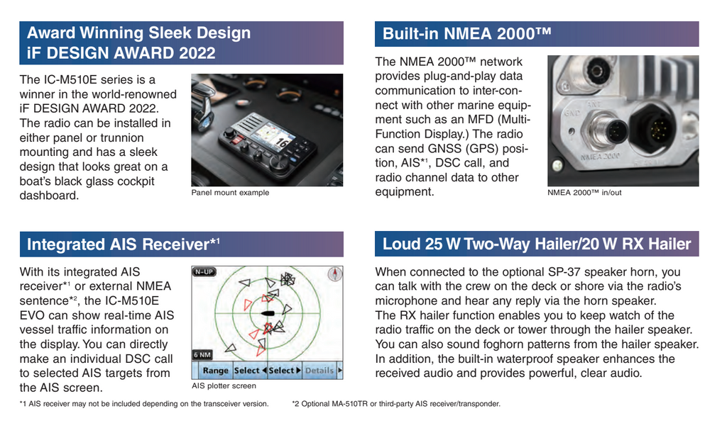 The IC-M510 series (including IC-M510 EVO) is a winner in the world-renowned iF DESIGN AWARD 2022. The radio can be installed in either panel or trunnion mounting and has a sleek design that looks great on a boat's black glass cockpit dashboard.