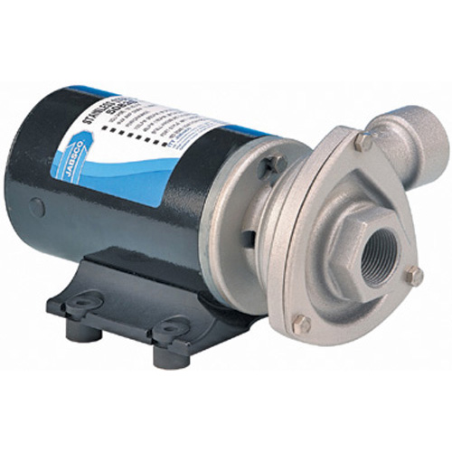 This heavy duty centrifugal pump has - stainless steel head and and open, no-clog impeller design to easily handle small debris and high temperatures. Suitable for fresh or salt water, bilge water and mild chemicals.
