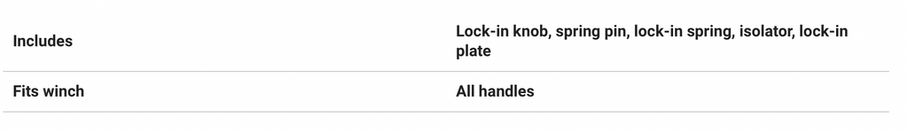 The Lock-in Winch Handle Repair Kit includes a lock-in knob, spring pin, lock-in spring, isolator, and lock-in plate. Fits all Harken® winch handles.