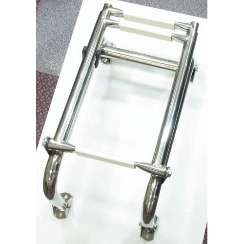 A three step ladder that folds and telescopes. 316 grade stainless steel throughout. Step rungs are pressed oval for comfort and are fitted with anti-slip. Pivoting mount brackets provide easy installation. 10º to transom.