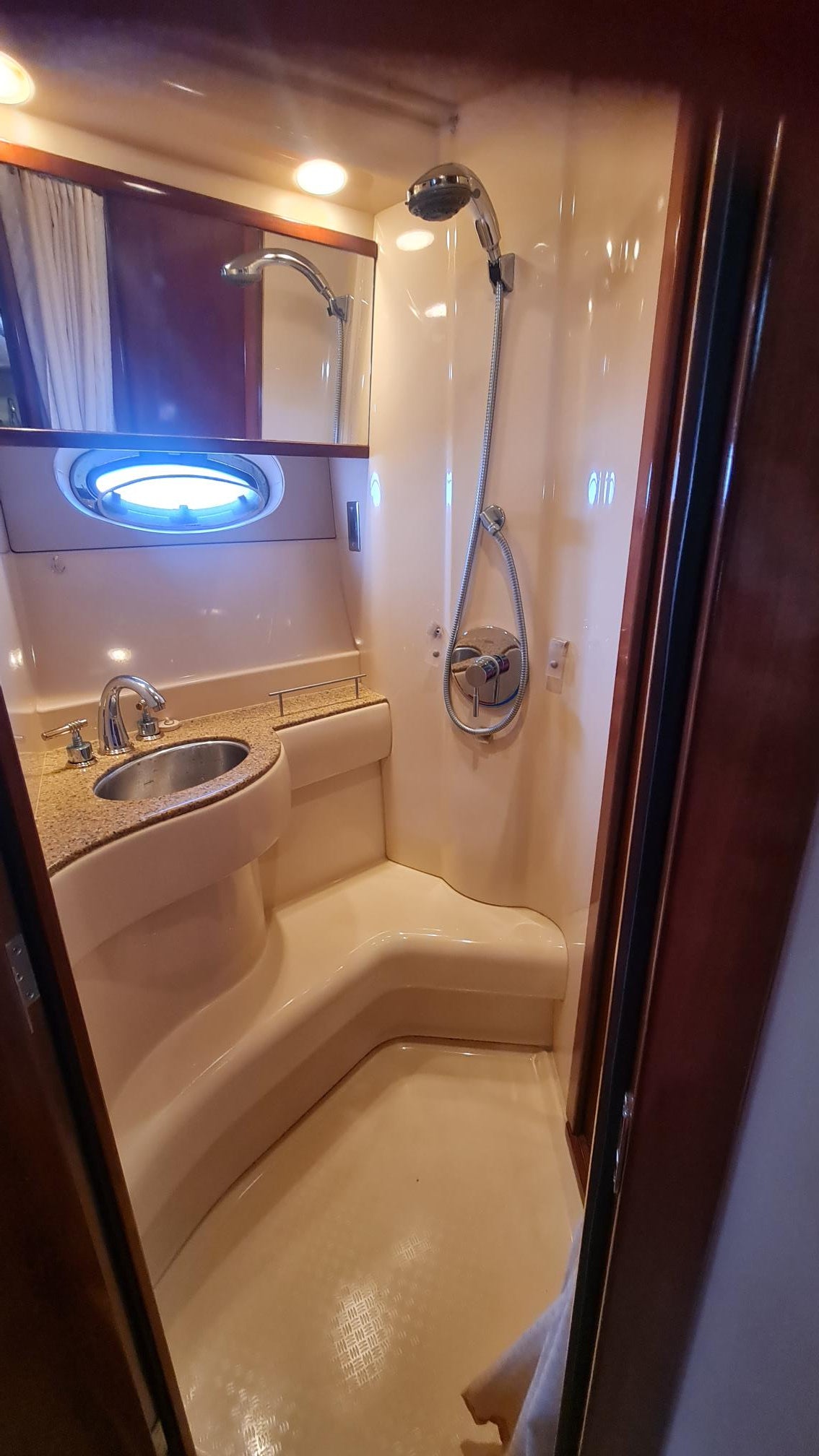 Down a short staircase, you'll find two private staterooms with island-style berths -- providing real, properly-sized beds. Standout feature is the split head and shower arrangement, with the toilet located in its own separate compartment and the shower in a dedicated stall -- allowing two people to use the facilities at once for convenience and privacy.