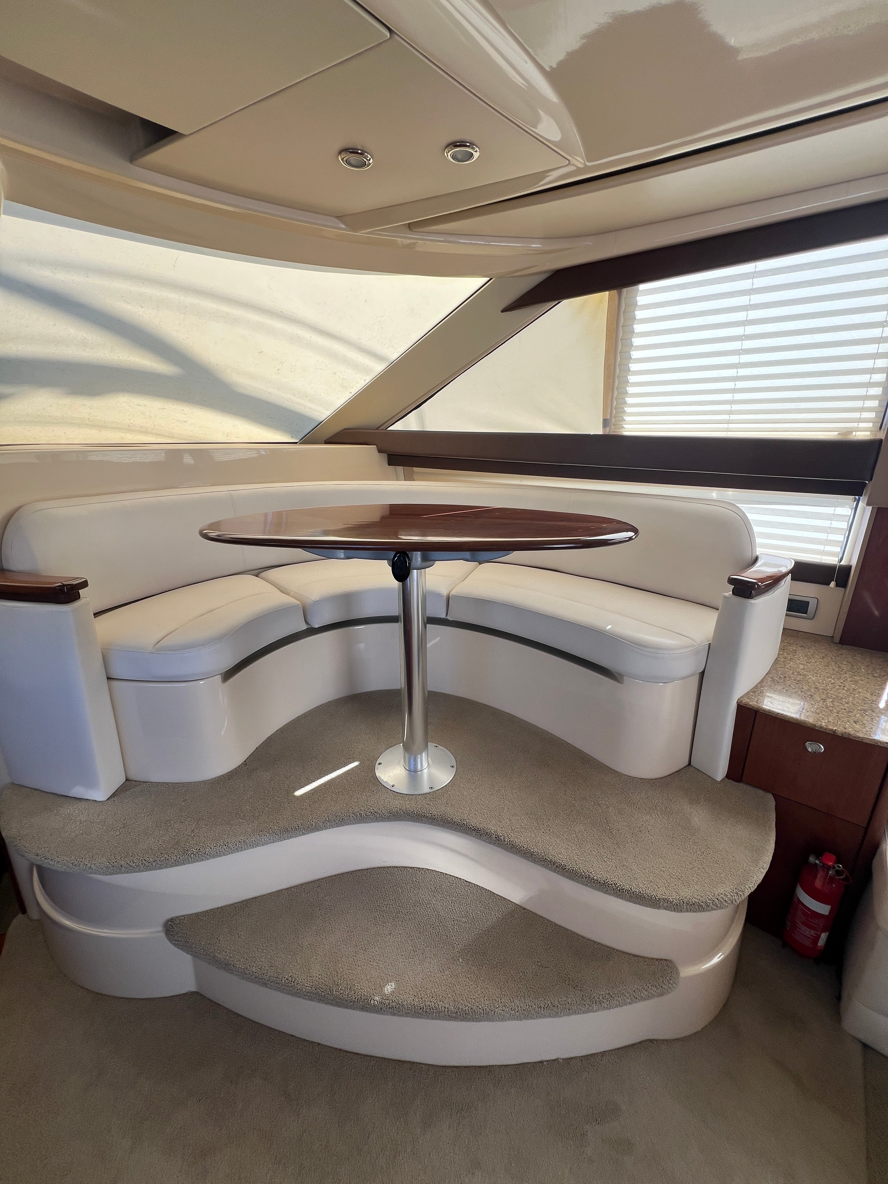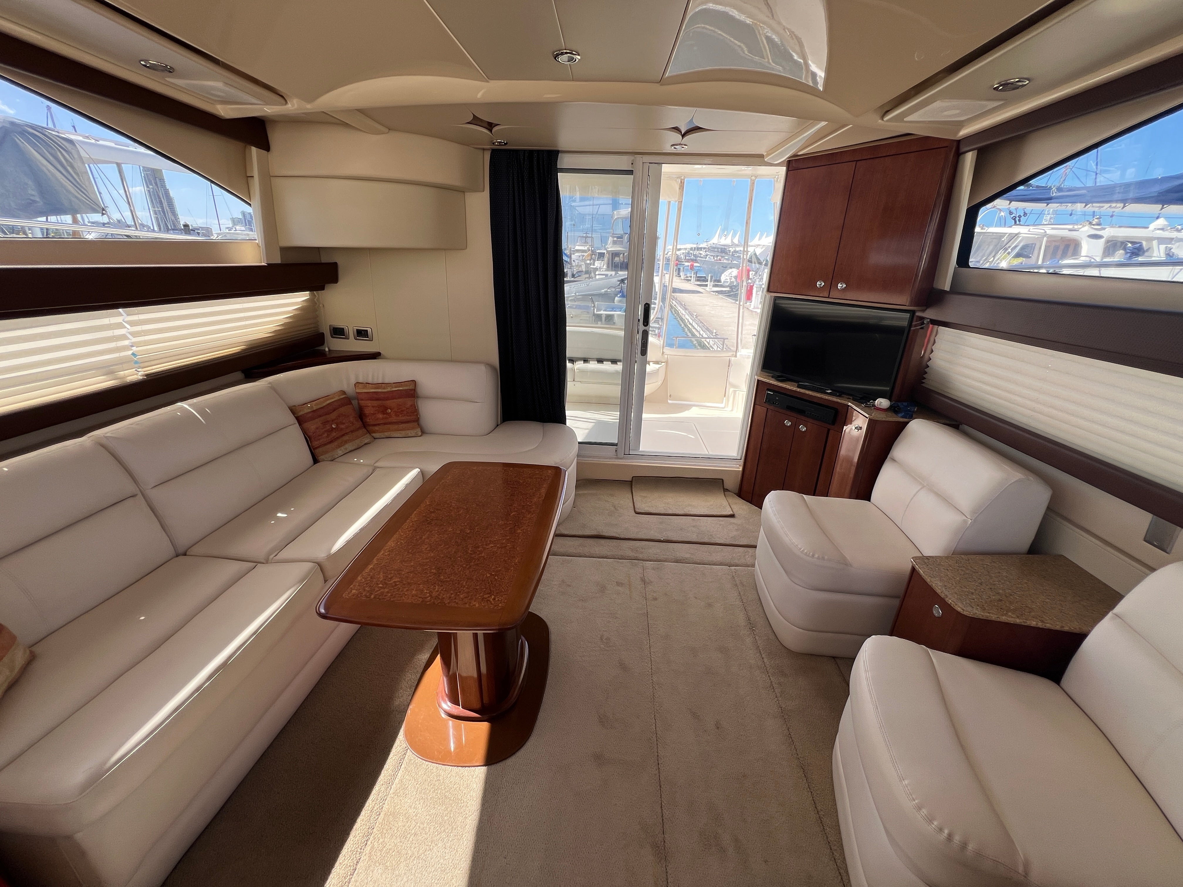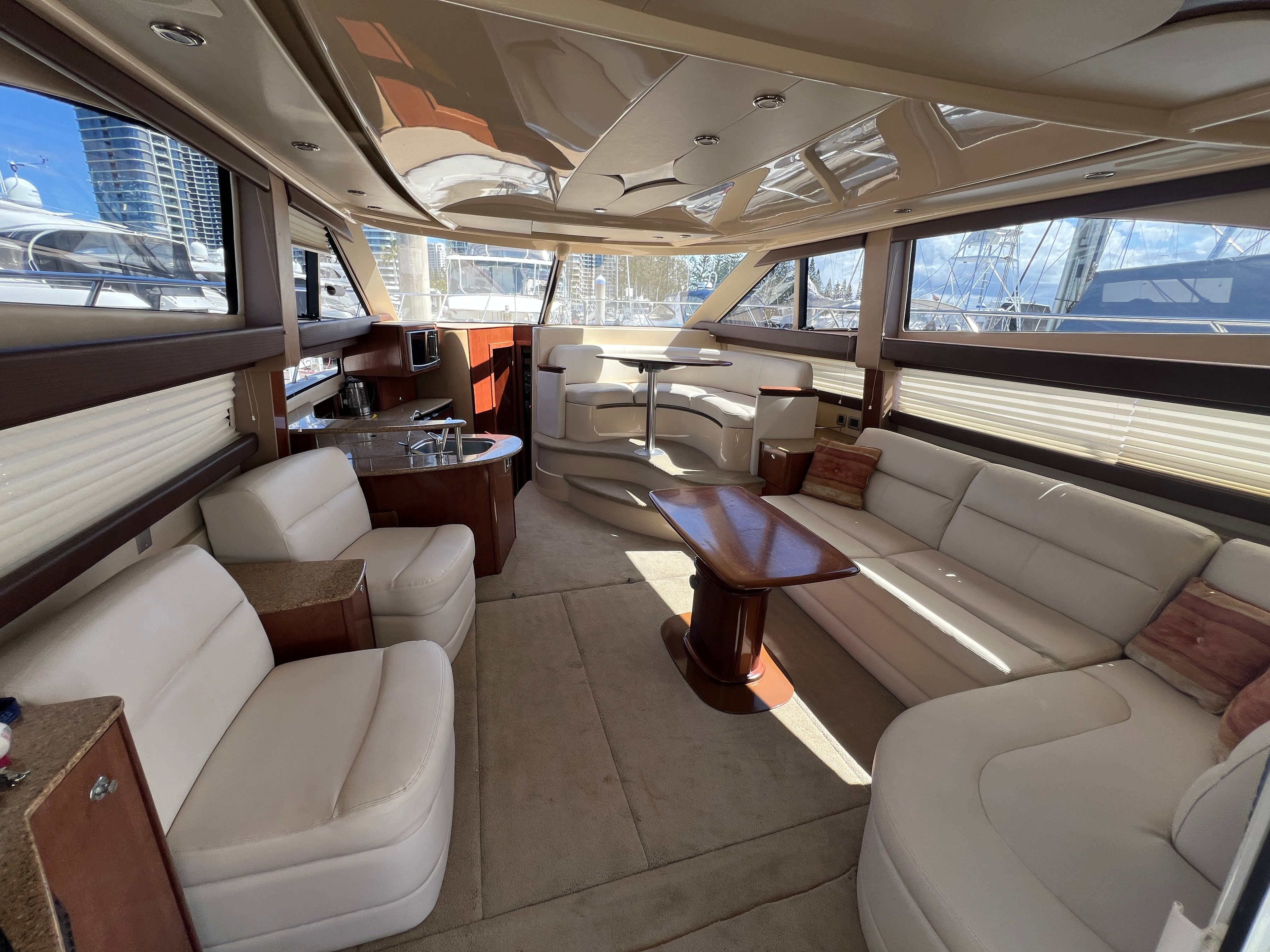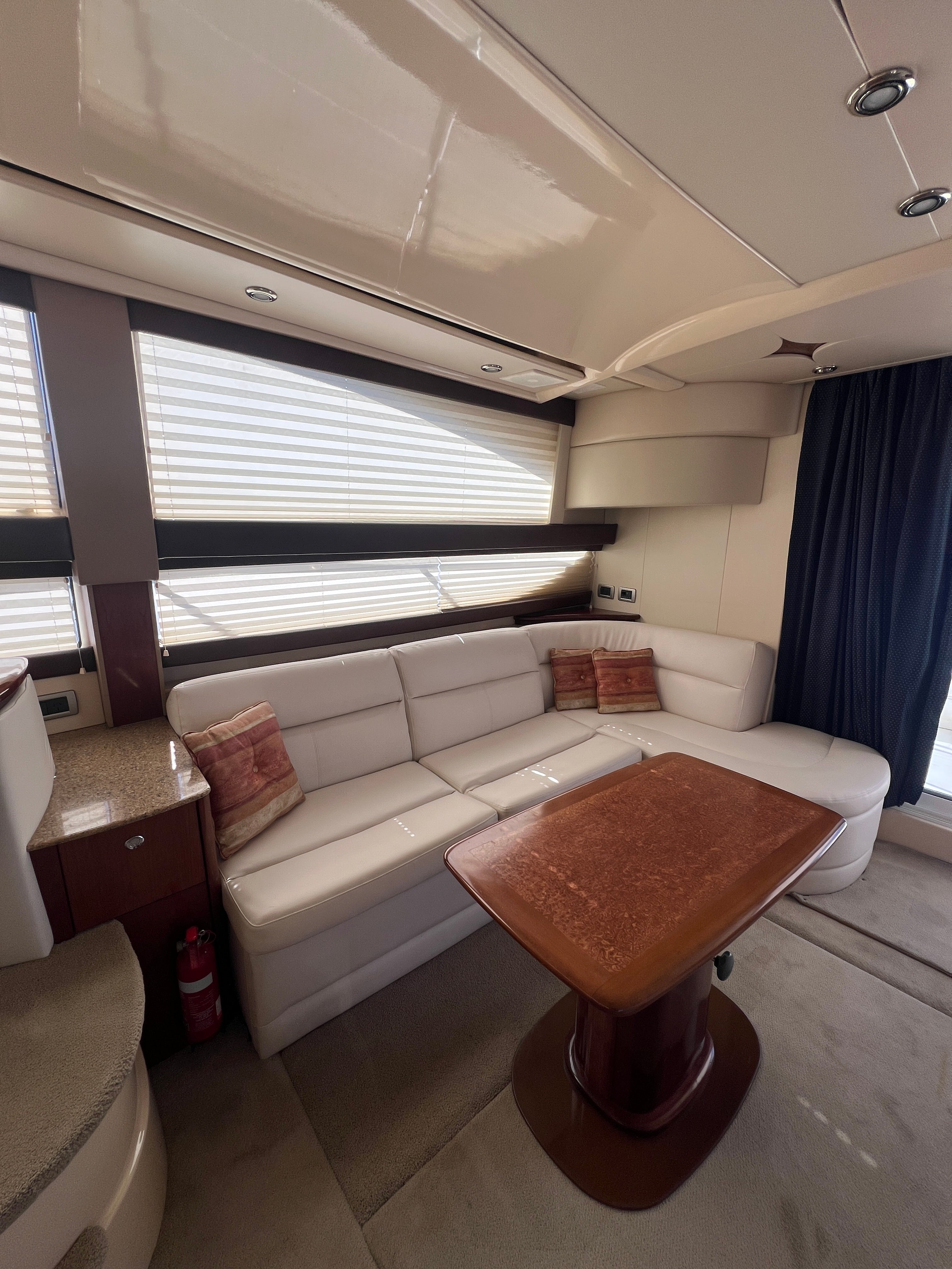 The saloon is designed for comfort and socialising, with a lounge area surrounding a coffee table. A slightly raised dining area is positioned forward, allowing diners clear sightlines through the boat's forward windscreen - perfect for enjoying the view while seated. Large windows fill the saloon with natural light, enhancing the airy and inviting atmosphere. The warm wood finishes add a welcoming touch.