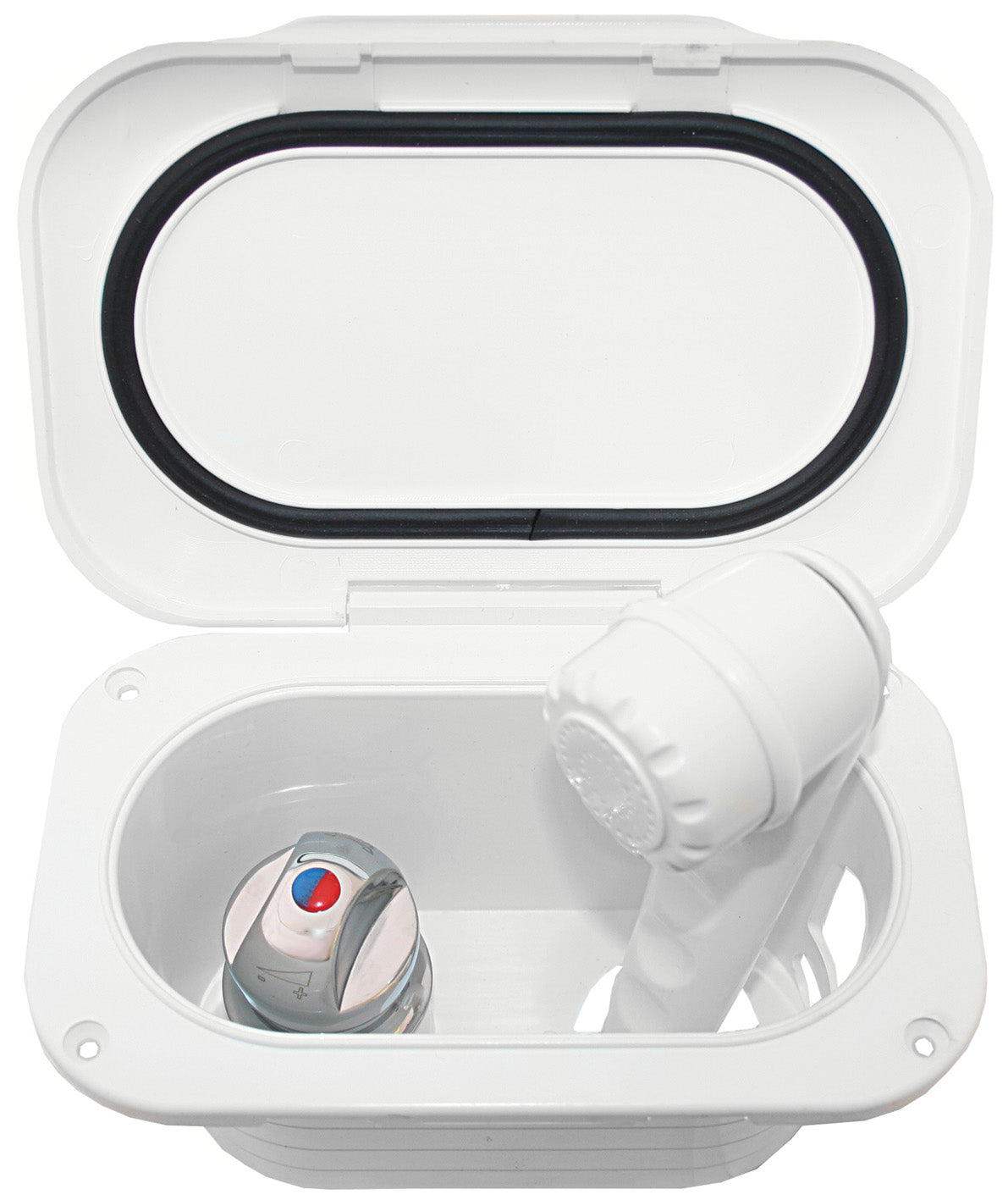 Concealed fastening holes for a neat finish. Flush mounting aft deck swim shower kit includes: