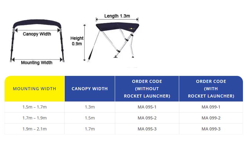 - 3 Bow Whitewater Pro Bimini canopy length 1.3m (front to back) and 0.9m in height. Optional Upright Extensions (pair) adding 15cm in height can be purchased separately