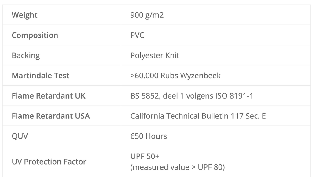 - Flame Retardant UK: BS 5852, deel 1 volgens ISO 8191-1