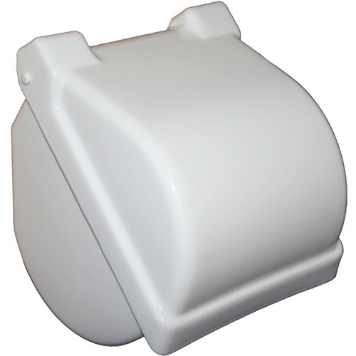 White plastic toilet roll holder with a hinged full cover to stop the toilet paper getting wet in the bathroom.