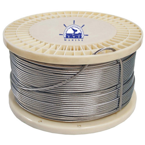 Top quality Korean made 316 grade stainless steel wire rope. Very strong, non-corrosive and cuts well. Available in a range of sizes (imperial) in 305 metre reels. 1 x 19 rigid wire stretches the least and is the strongest wire rope for it's size. It is not flexible and is used mainly for standing rigging.