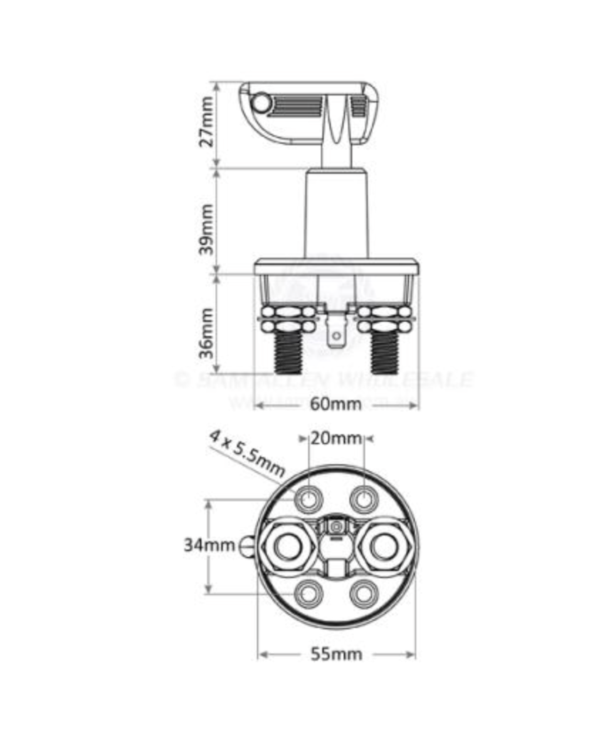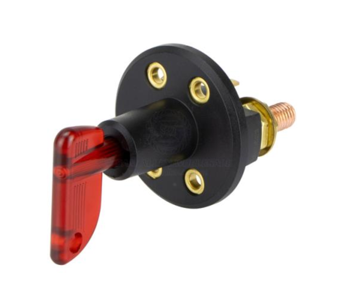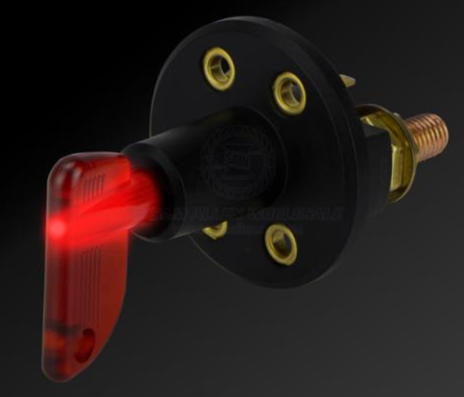 | • 2 position switch - On / Off. • Ignition protection. • Red LED indication. • 39mm protrusion without key. • 20mm M10 stud size. • Removable key (turn key to off to remove). • Rated protection: IP66. • Load rating @12V: 300A maximum continuous. 1000A for 5 seconds. |