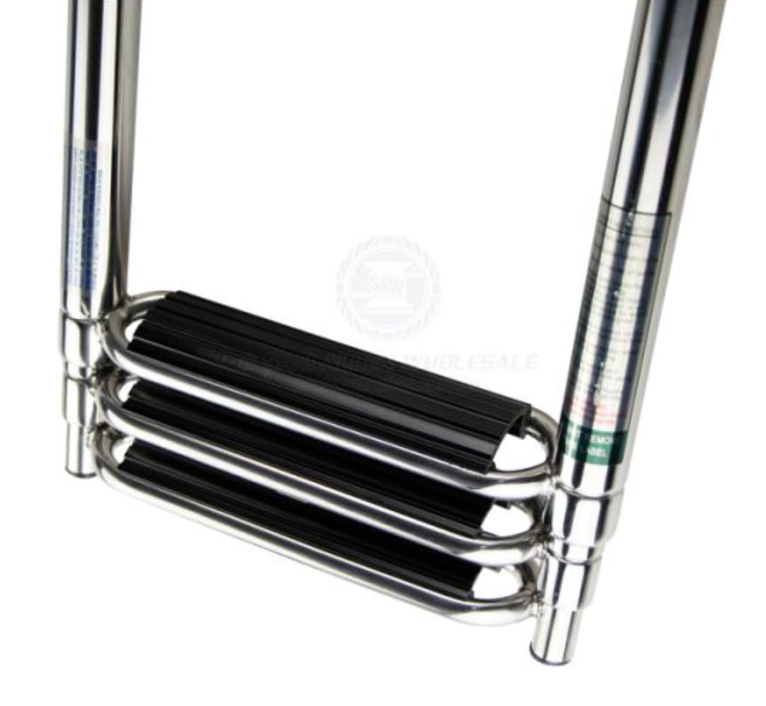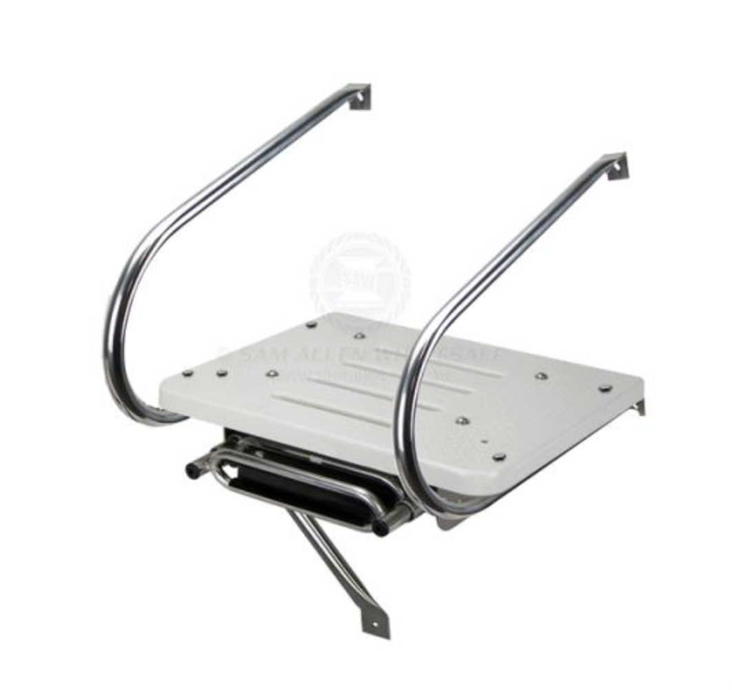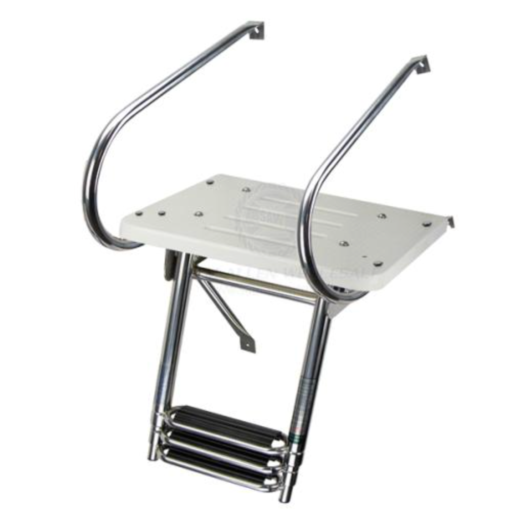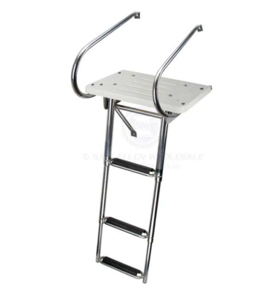 | • Fibreglass moulded around a timber platform. • Highly polished 304G stainless steel tube. • Ladder folds away for easy storage. • Non-slip plastic treads on steps. • All fasteners and bracket supplied for easy installation. • Port or starboard grab and support rail mount (may require drilling additional holes in platform of 47223). |