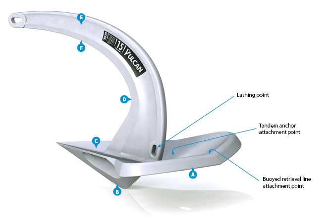 Breaking from the Rocna design, the Vulcan features a unique combination of shank and fluke geometry – including an innovative roll-palm™(A) at the rear of the fluke – which self-rights the anchor on the seabed without the use of a roll-bar. This is assisted by the V-bulb™ (B) which extends fluke ballast downward to gain maximum leverage and efficiency. This development permits a larger fluke surface area than competing designs which rely on simple dead weight, while the concave fluke (C) is similar in design to the Rocna, directly equating to more holding power and security.