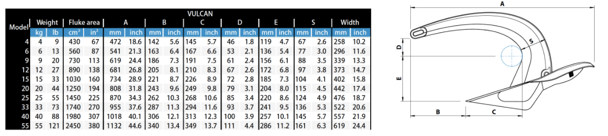 Vulcan anchors are available in 10 sizes from 4 kg (9 lb) – 55 kg (121 lb) to suit vessels from small runabouts to larger launches. Galvanized and stainless steel options are available in all sizes.