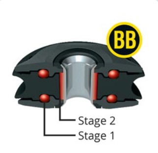 Stage 2 - Under heavy loads, where deformation of ball bearings alone would result in increased friction, a sliding Acetal bearing on a polished stainless steel race takes over, maintaining low friction performance.