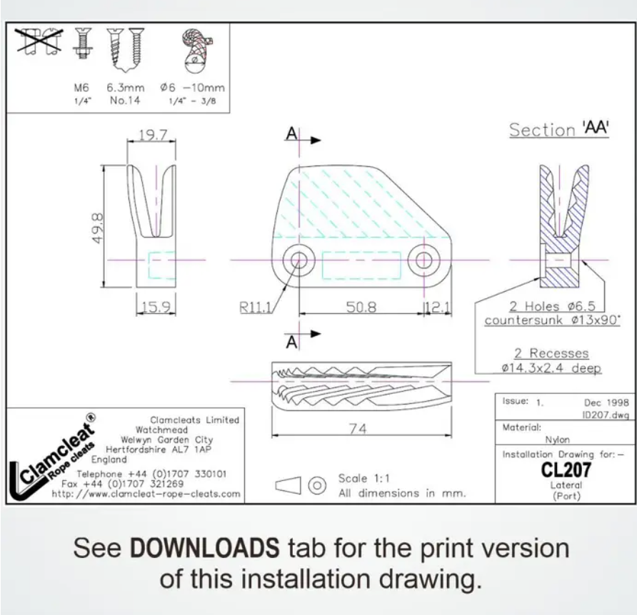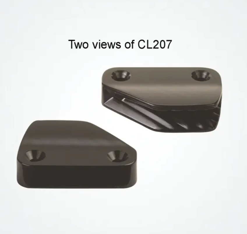 The Clamcleat® C207 is a cost effective nylon cleat that has a low profile on flat or vertical surfaces. Ideal for control lines on dinghies and sailboats, as well as a variety of non-marine applications. Fix with countersunk (flathead) bolts or screws.