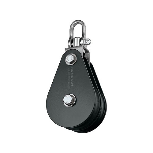 Double block with two 75mm (3") sheaves, swivel shackle head and black powder coated 316 stainless steel side plates.