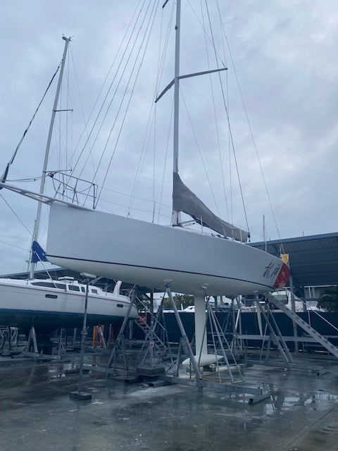 Just lifted at The Boat Works (January 2026) antifouled, rudder bearings replaced, paint repairs & polish, prop out, seacocks etc checked, new starter battery put in.Ā
