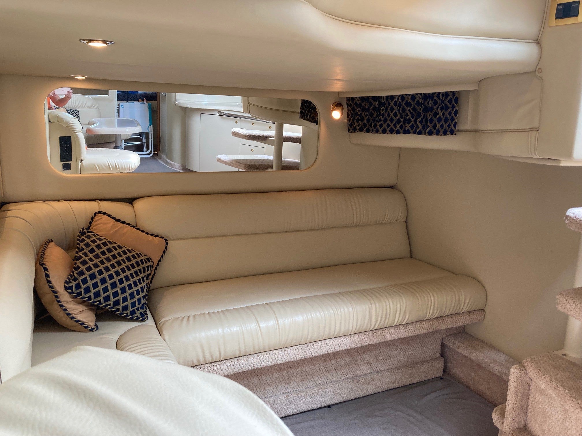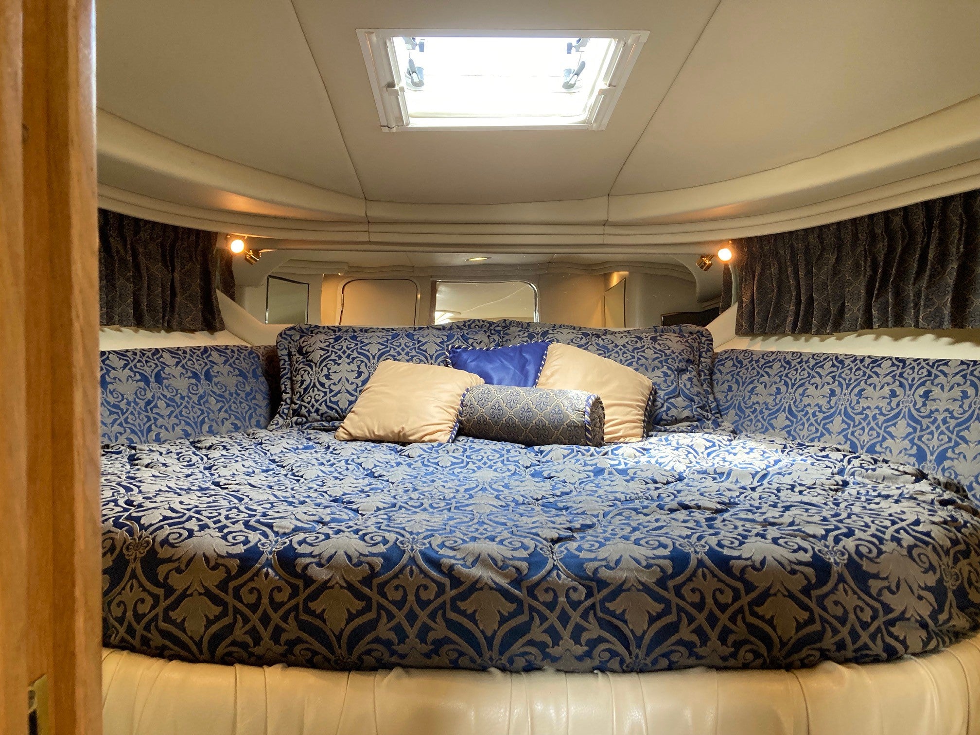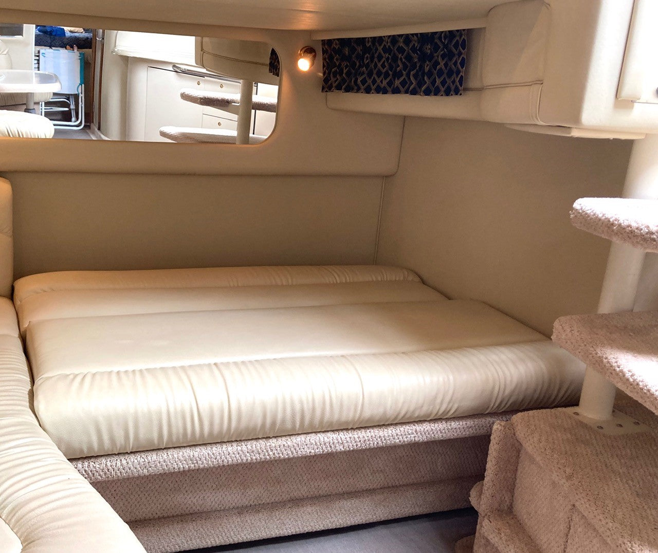 Twin cabin layout forward berth island bed, aft and main floor with lounge or pull out dble