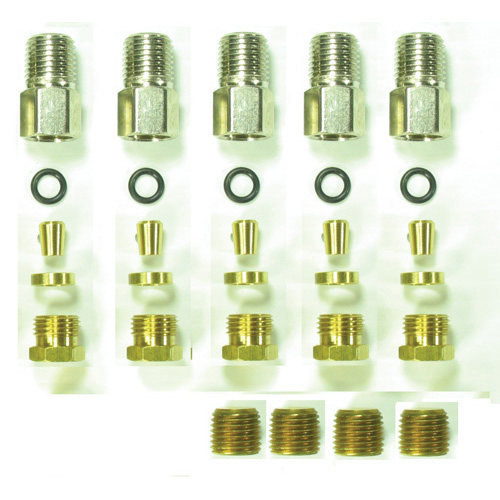 Includes all the plumbing components required to connect the R-13 Reservalve to 5 ⁄16" nylon semi-rigid tubing in a single engine installation. Four black plugs are included to stop the ports normally used in twin engine applications. All brass hardware.