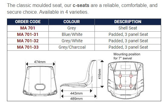 The classic moulded seat, our c-seats are a reliable, comfortable, and secure choice. Available in 4 varieties.