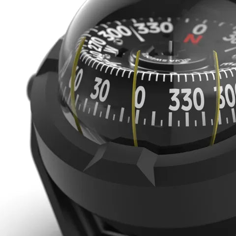 It has a main steering scale on the horizontal part of the compass rose and a direct reading on the vertical edge. This makes the compass ideal for boats with a sitting as well as a standing helmsman.