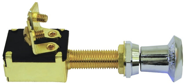 Brass push-pull switch. 2 position - on or off. Brass switch unit with chrome plated knob. Rated at 25 amps - suits 12 or 24 volt. Dash thickness : max 20mm Shaft stem diameter : 9mm